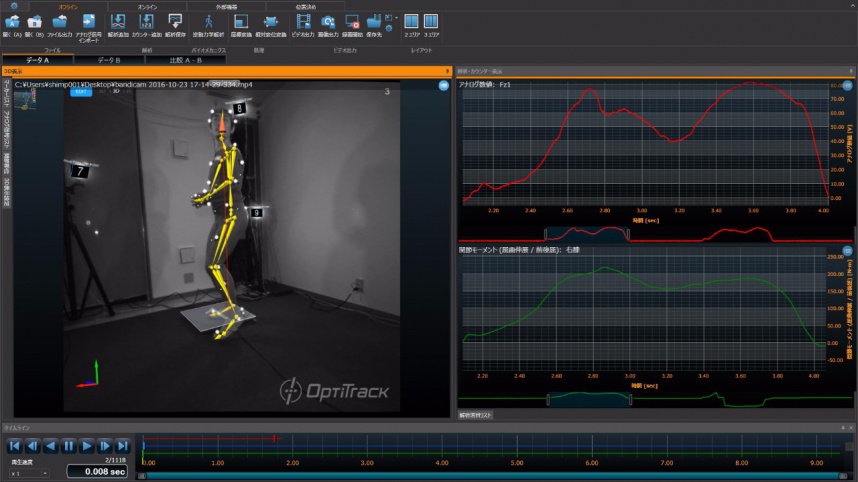 OptiTrackのMotive: Bodyにて床反力計と組み合わせて取得した動作データを用いた、学術的に裏付けのある日本人の骨格モデルに基づいたアルゴリズムを用いた関節中心算出および動力学計算による屈曲伸展や内外旋等の関節角度、関節モーメント、関節パワー、身体重心等を計算し、比較解析を行う事が出来ます。筋電や脳波、心拍等の生体信号も取り込み、複合的な解析を行う事が可能になります。