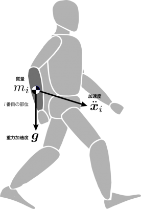 この身体重心の式は「各部位の質量で重み付けされた加速度」を意味しています.また,質量が大きい部位は,一般に体幹回りや下肢にあります.