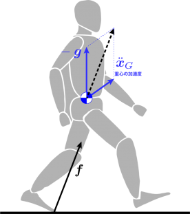 のように書き換えることができます.すなわち,床反力 f は,身体重心の加速度と重力加速度で決まることがわかります.静止して,身体重心のxGの加速度が0なら,体重と等しくなります.もし運動すれば,さらに身体重心の加速度に比例して変動することになります.