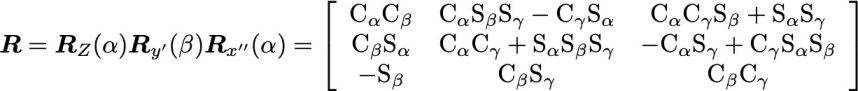 のように書き表されます(ZYXオイラー角の過去の表記に誤りがあり,訂正いたしました.お詫び申し上げます.2022.12.16).ここで,Cα, Sβはcos α,sin βを示しています.この他,同じZ軸回りの回転を2回行う,ZYZオイラー角も存在し,Rz(α) Ry(β) Rz(γ)のように計算することができます.このことから想像できますように,オイラー角は角度によって定義が異なり,多くの角度定義が可能で(Z-Z-Zオイラー角のような角度は存在しません),その定義は回転の順番に依存しています.