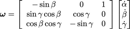 のようになりますので,オイラー角の初期角度(α(0),β(0),γ(0))を与えて,α,β,γに関するこの非線型の微分方程式を数値積分して解くことになります.(角速度の式に表記に誤りがあり,訂正いたしました.お詫び申し上げます.2022.12.16)