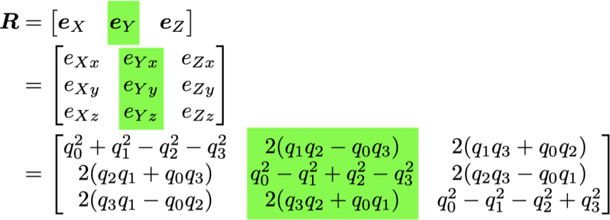 の緑の部分が,物体に固定されたローカル座標系の eY の絶対座標系における各xyz成分に相当し, eY の絶対座標系における方向がわかったことになります.