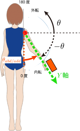 なお,装着方法をそのままにして運動方向を変えるだけで,「腕の伸展・屈曲角度」も,同じ式で計算できます.