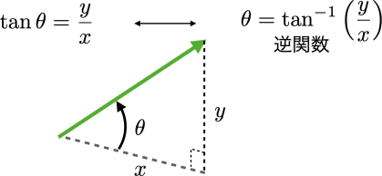 ここで,atan2(y, x)はtan()の逆関数(tan()とは反対に,xとyから角度θを出力する関数)のPythonやC言語などで使用できる組み込み関数で,atan2()は2引数,水平成分xと鉛直y成分をとり,引数の順番が(y, x)となっていることに注意をしてください.
