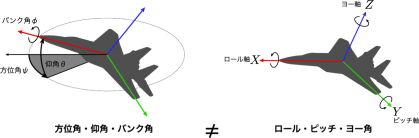 これらは,紛らわしい名称で,ローリング角がバンク角,ピッチング角が上昇角,ヨー角が方位角のような連想をしてしまいますが,ロール角,ピッチ角,ヨー角は,各軸回転角度を反映していません.繰り返しになってしまいますが,ロール,ピッチ,ヨー角に限らず,物体に固定された軸のまわりの回転角度とは一致しません.