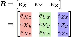 この単位ベクトルをeX, eY, eZとすると,この単位ベクトルを並べたもの(基底)が回転行列Rとなります.つまり,姿勢は回転行列で表現します.これが基本となります.