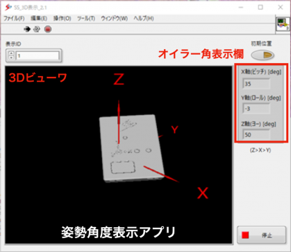 姿勢角度表示アプリでは,リアルタイムでセンサを動かしながら,3Dビューによるグラフィックスと,ZXYオイラー角の数値を,センサを動かしながら確認することができます.