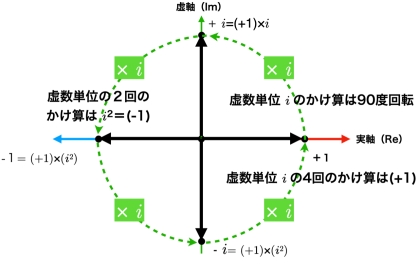 この図のように,(この図では大きさが1の)複素数に虚数 i をかけることは,複素平面上で90度の回転に相当します.