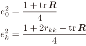 のように表されるとき,回転角度に関係するパラメータe0と,回転軸に関係するパラメータek = e1, e2, e3 (k=1,2,3)は,下記のような関係を満たします.