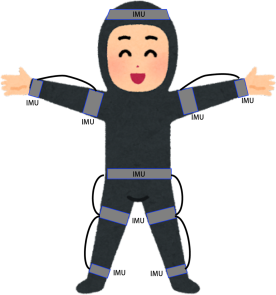 骨格推定のように関節位置だけでなく(図3参照),各部位の3次元の姿勢(たとえば大腿や下腿などの部位の長軸周りの回転も含めた姿勢角度.クォータニオンなどで出力)を出力できます.近年,多くの非光学式モーションキャプチャの製品が増えてきました.