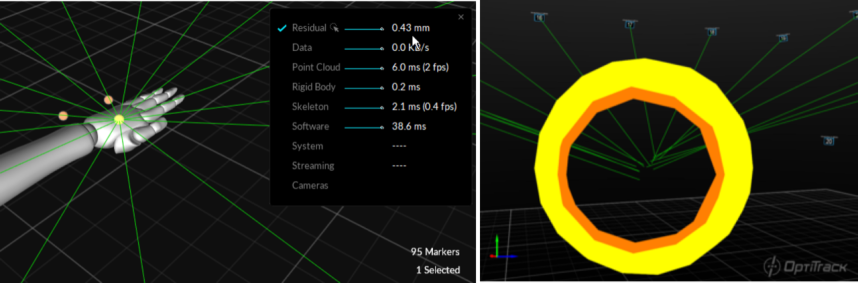 そこで一旦キャリブレーションが終われば,カメラ定数を利用し各カメラから撮影された反射マーカの方向が図8の緑色の線(Ray・光線)として算出されます.しかし,1台ではカメラから見た奥行方向の情報がわかりません(カメラからするとRay上にある点はすべて同じ位置に見えてしまいます).そこで,複数台のカメラで撮影し,図8の左図のように,その線が最も集中する点をリアルタイムで計算し,その点を3次元位置とします.このため,最低でも2台のカメラから反射マーカが撮影されている必要があります.しかし,実際には誤差が少なからず発生しますので,線が厳密に交わることはありませんので,最も線間の距離が最小となる(集中する)点を算出します.図8の右図は,OptiTrackでマーカを拡大して,さらにマーカの内部を透視して見ている様子です(OptiTrackを使用すれば実際に確認できます).実際には各カメラから見た緑色のRay(光線)は交わることはなく,最もRay間の距離が短いところを3次元位置として算出しています.このようなプロセスでマーカの3次元座標が復元(計測)されます.