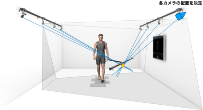 カメラに撮影される前述のマーカーの重心位置は2次元情報なので,複数台のカメラを使用しないと3次元位置を同定できません.一般にカメラの台数が増えれば,精度良くかつ広範囲に計測が可能となります.