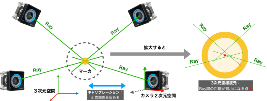 図9にキャリブレーションと3次元座標復元についてまとめました.キャリブレーションとは3次元座標とカメラの2次元座標の空間的な関係を記述するカメラ定数を算出する作業で,基準となる3次元空間に対して各カメラの2次元空間座標の配置・姿勢等を決める作業に相当します.3次元座標復元(計測)とはそのカメラ定数で算出された各カメラからみたマーカを示す「各Ray(光線)間の距離が最小となる点」,すなわち図中の赤色の「Residualの和が最小となる点」を最小二乗法で計算する作業になります.