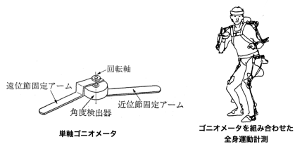 ゴニオメータ:もともとは身体運動に限らず角度を測る計測機器でしたが,医療・体育の分野などで昔から身体運動の関節角度を計測する機器として使用され続けています.一般的には身体各部位の長軸方向と一致させた軸間のなす角度や回旋角度を計測することが基本で,典型的なセンサとしてポテンショメータ(軸の回転角度に応じて抵抗値が変化する可変抵抗)を使用したもが多いですが,現在では多様に変化しています.その発展形として光ファイバを使用したデータグローブなどもあります.図4右図のように全身の3次元計測を行うことはあまり現実的ではありませんし,精度もあまりよくはありません.部分的な関節角度等を気軽に計測するときには適したセンサです.