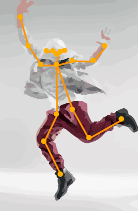 骨格推定:機械学習や深層学習の技術発展から近年登場した新しい計測技術です.関節などの特徴点にマーカなどを貼付することなく認識し,無拘束の計測を実現するため.マーカレスモーションキャプチャなどとも呼ばれます.OpenPose(注4)に代表され,身体の動きをビデオカメラで撮影し,主要な関節点(手首,肘,股関節等)の位置を,2次元や3次元で出力することができます.機械学習の結果を利用しているので,通常の3次元計測と異なりキャリブレーション等が不要であったり(3次元化で必要なケースもあります),複数人の動きを算出したり,動画に重ね合わせて骨格(スティックピクチャとも呼ばれる,関節を結んだ線画.図3参照)を表示することも可能となり便利なシステムです.精度は決して良くありませんが,静止画も含めてカメラで撮影するだけで手軽に運動を計測できるため,利用が広まっています.