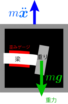加速度センサの内部は各社で異なりますが,多くのタイプのセンサでは実は力センサが内蔵されていると考えてください.実際のセンサの内部構造と異なりますが,歪みゲージ型の加速度センサと同様に,梁に作用する歪みを測っていると考えるとわかりやすいです.
