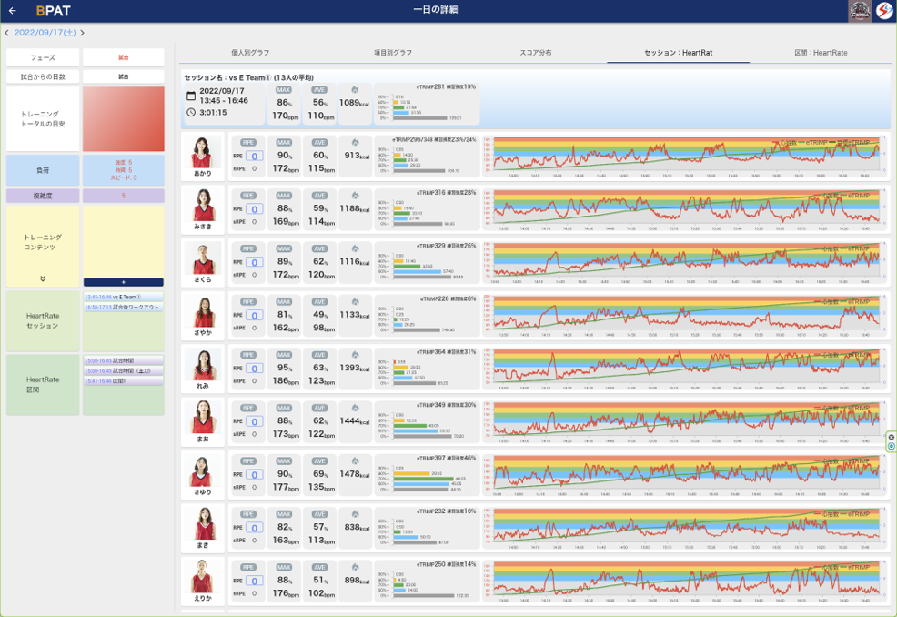 最大心拍数に対する心拍ゾーンごとに選手の表示の色が変わるので、現在の負荷の状況が一目でわかります。