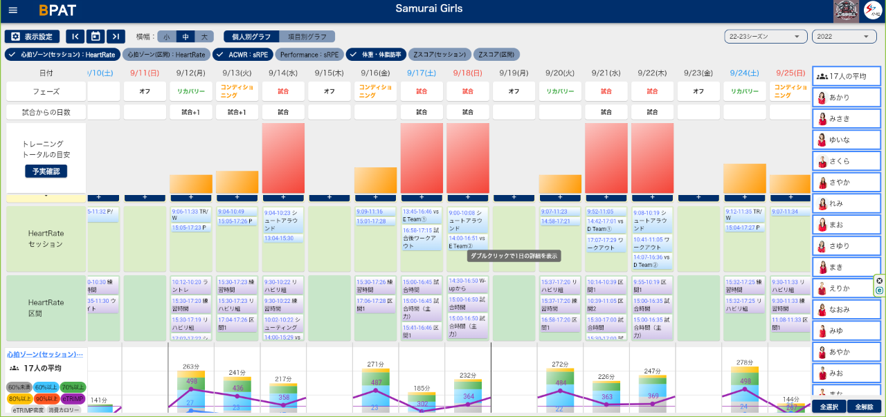 あらかじめ意図したトレーニング、練習となっていたかどうか。ピリオダイゼーションを考える上で、週を見通すことができるトレーニング計画と履歴は、非常に重要です。BPAT Cloudでは、シーズン開始設定をされた日付を第1週としたトレーニング計画/履歴管理のDX機能をお使いいただけます。