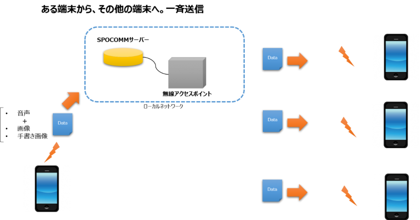 SPOCOMMはコンパクトな専用サーバーと、付属する複数台のスマートフォンからなる新基軸のスポーツコミュニケーションシステムです。従来のスポーツ向けコミュニケーションシステム同様の音声の一斉送信はもちろん、画像や手描きイラストなどの送信も可能です。スポーツ競技向けタイマーや、チーム全員が計測可能な心拍センサなど、SPOCOMMはスポーツにおける様々な機器との連携も可能です。詳細や導入方法については、後日公開されるスポーツセンシングの公式サイトをご覧ください。